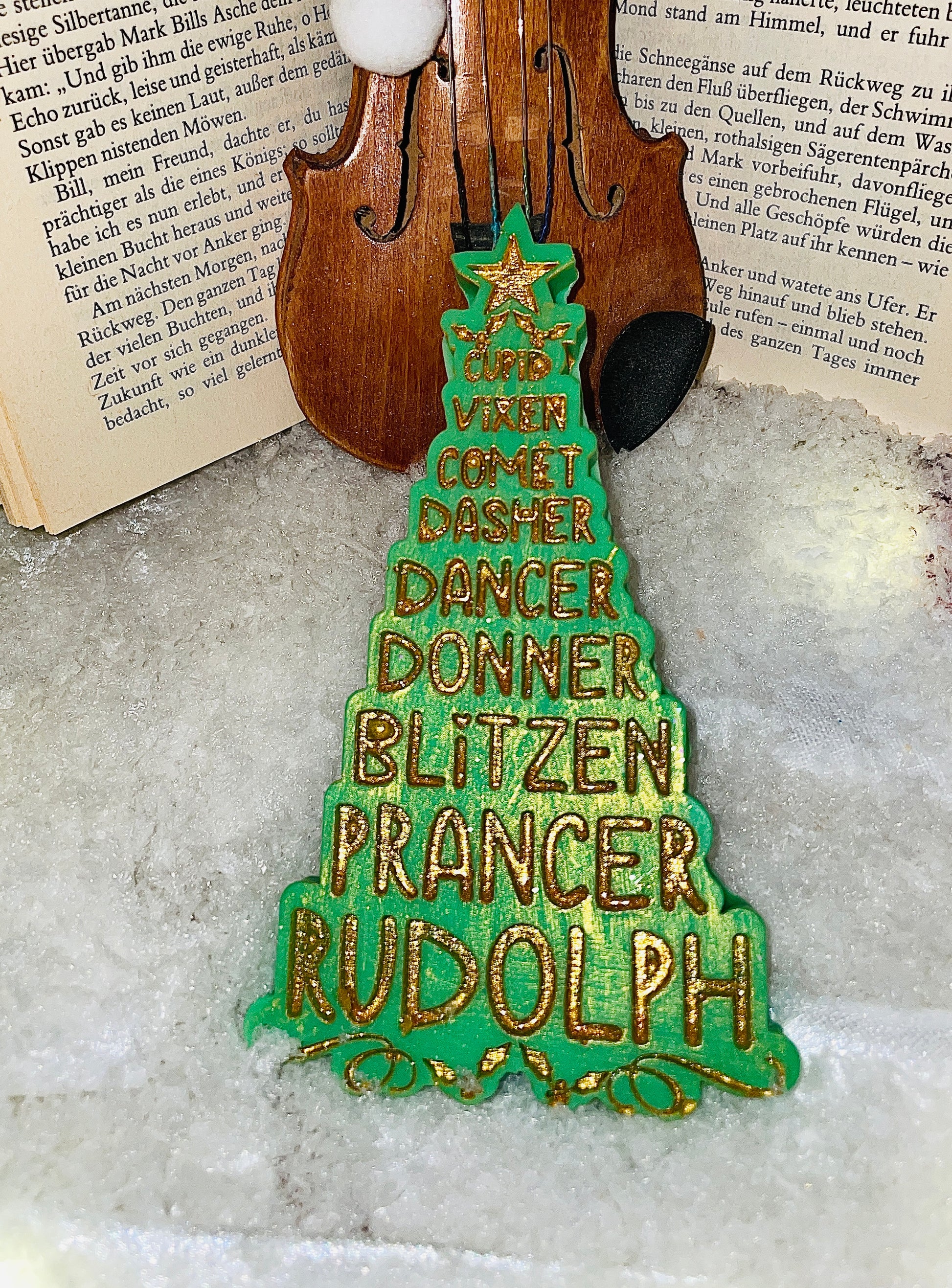 Santa’s Crew ist eine festliche Snap Bar in Form eines stilisierten Weihnachtsbaums – verziert mit den Namen von Santa Claus’ berühmten Rentieren: von Dasher bis Rudolph.